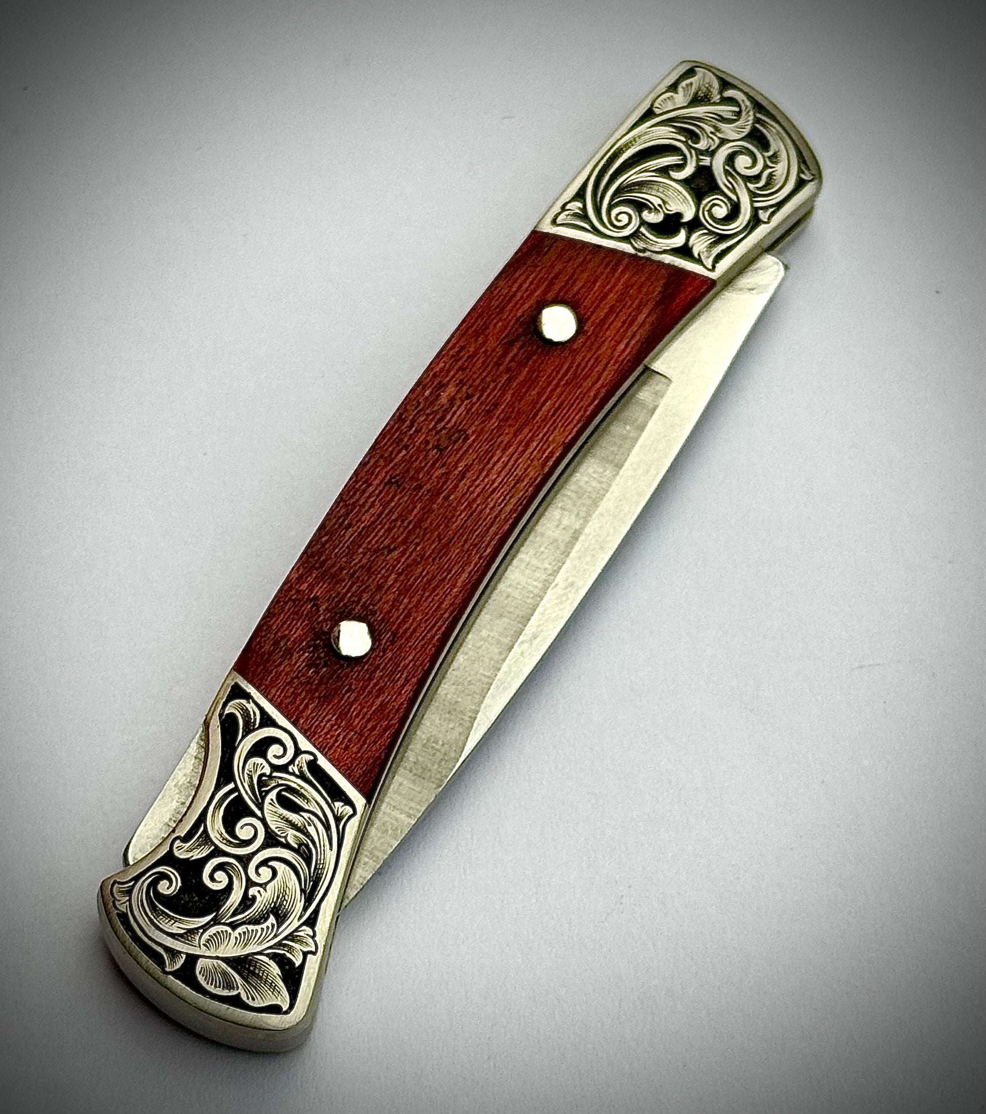 Hand Engraved Buck 503 Prince folder knife with nickel silver bolsters. Bull motif with scrolls
